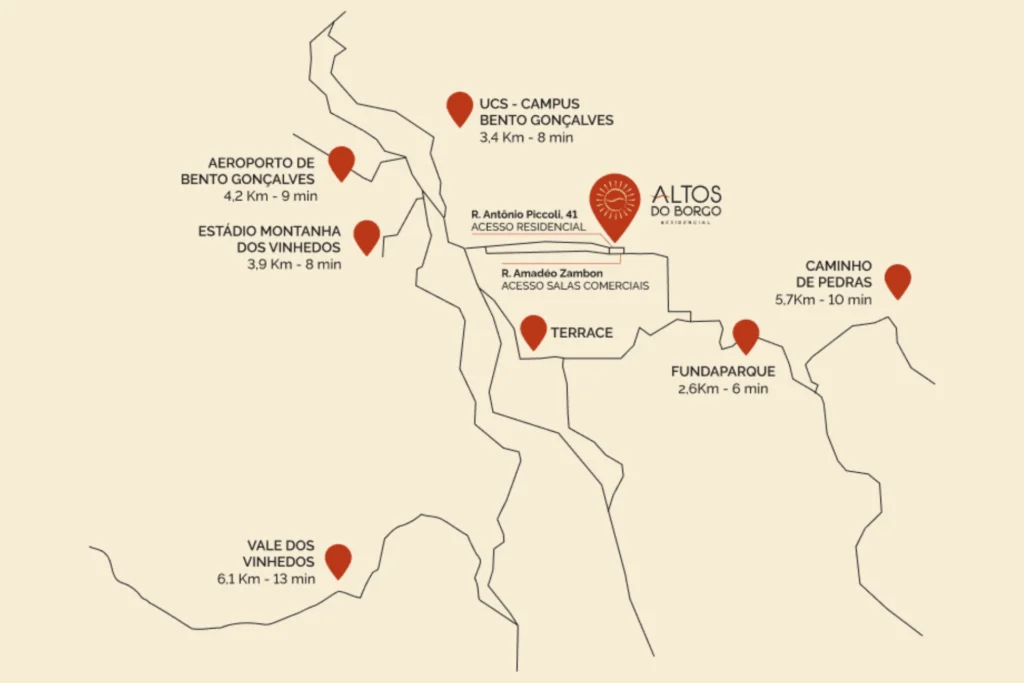 Vista panorâmica deslumbrante de Bento Gonçalves, em uma das regiões mais elevadas do Borgo. Acesso às salas comerciais pela Rua Amadéo Zambon e entrada exclusiva para o residencial pela Rua Antônio Picolli.